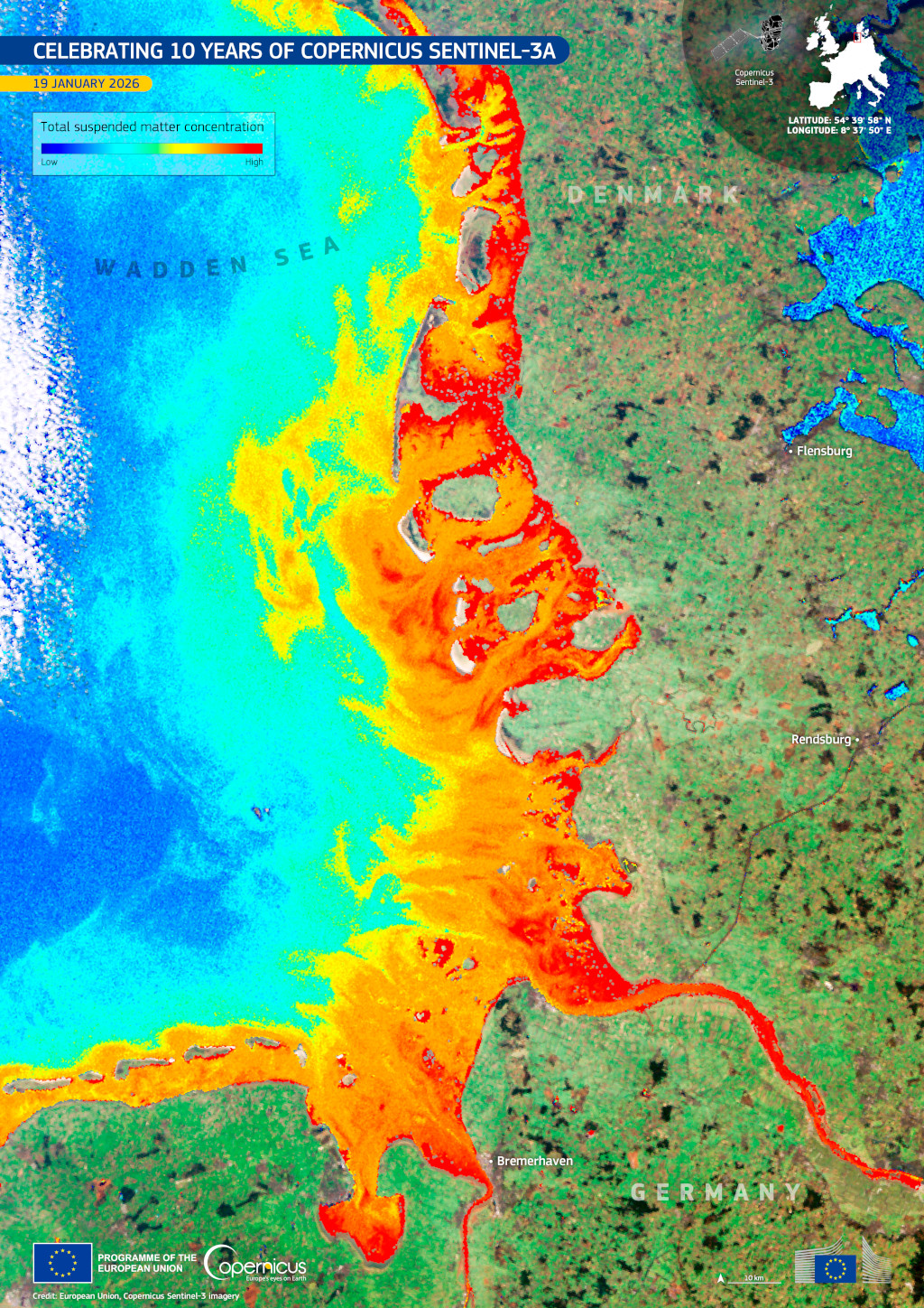 A Sentinel-3A egyik fő fedélzeti műszere, az OLCI (Ocean and Land Colour Instrument) 2026. január 19-én készített képe a Watt-tengert mutatja Németország és Dánia partjai mentén. A hamisszínes műholdkép jól illusztrálja a Sentinel-3 műholdak egyik erősségét, hogy egyszerre tudnak értékes adatokat szolgáltatni mind a tengeri, mind a szárazföldi környezetről. Itt a part menti vizekben lebegő hordalék élénk vörös és narancssárga színekben jelenik meg. A mintázatok feltárják az árapály hatására létrejövő áramlatok által felkavart, illetve a folyók által szállított hordalék előfordulási helyeit. A koncentráció a parttól távolodva csökken, ahogy a képen a tenger színe sárgába, türkizbe, majd kékbe fordul.